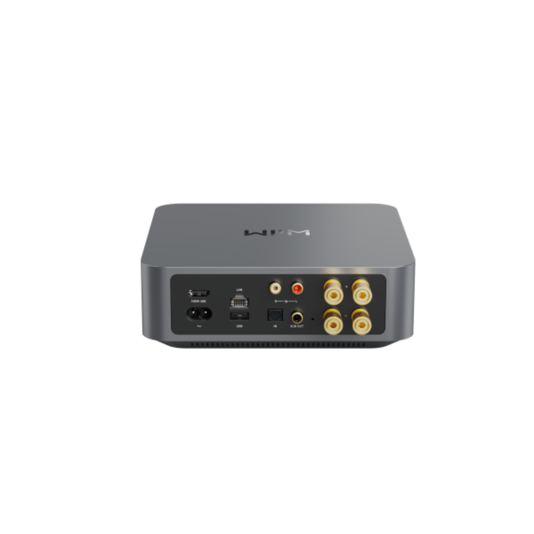 Der Class-D-Verstärker mit 60 Watt pro Kanal (8 Ohm) oder 120 Watt pro Kanal (4 Ohm) liefert High-Fidelity-Sound auch an anspruchsvolle Lautsprecher. Er bietet einen analogen (RCA), einen digitalen optischen Anschluss, HDMI ARC und eine nahtlose Wiedergabe von hochauflösender Musik mit bis zu 24 Bit/192 kHz, um Ihren Fernseher, Plattenspieler, CD-Player oder eine andere Audioquelle in die digitale Welt zu bringen. Der USB-Port dient zum Anschluss externer Speichermedien: Greifen Sie auf Ihre persönliche Medienbibliothek zu und verwenden Sie sie als Medienserver für andere WiiM-Geräte.